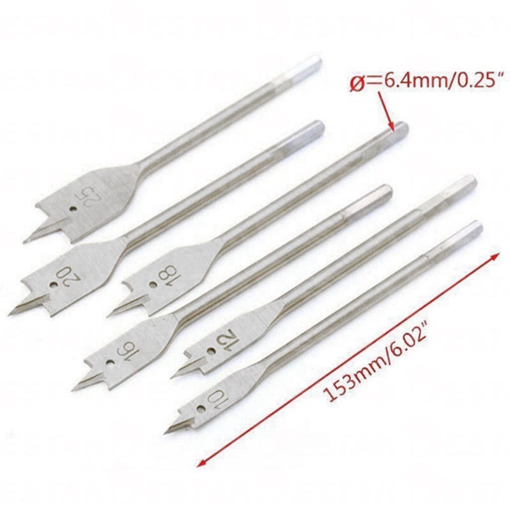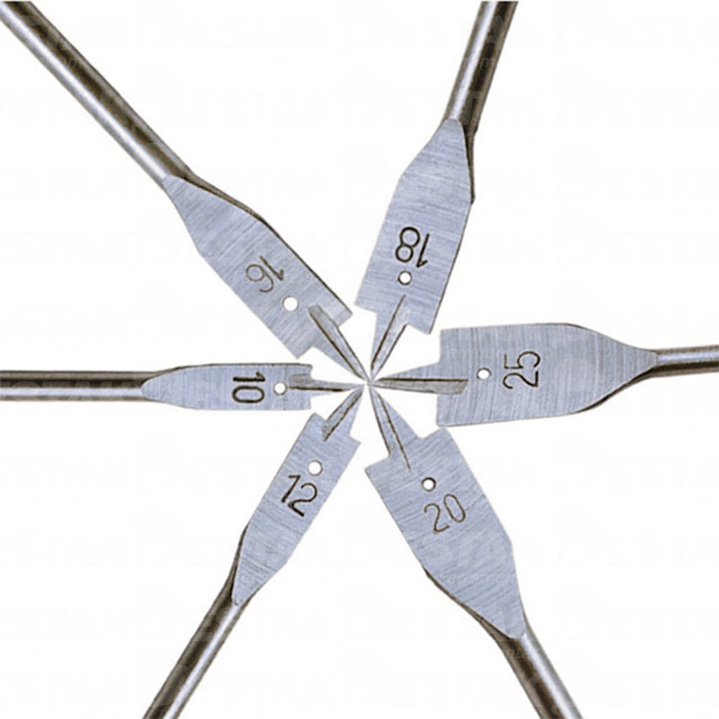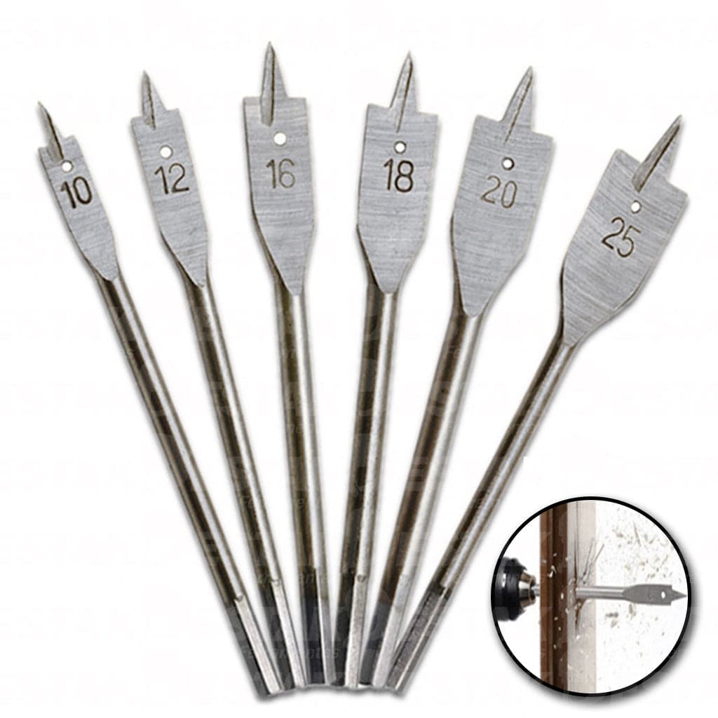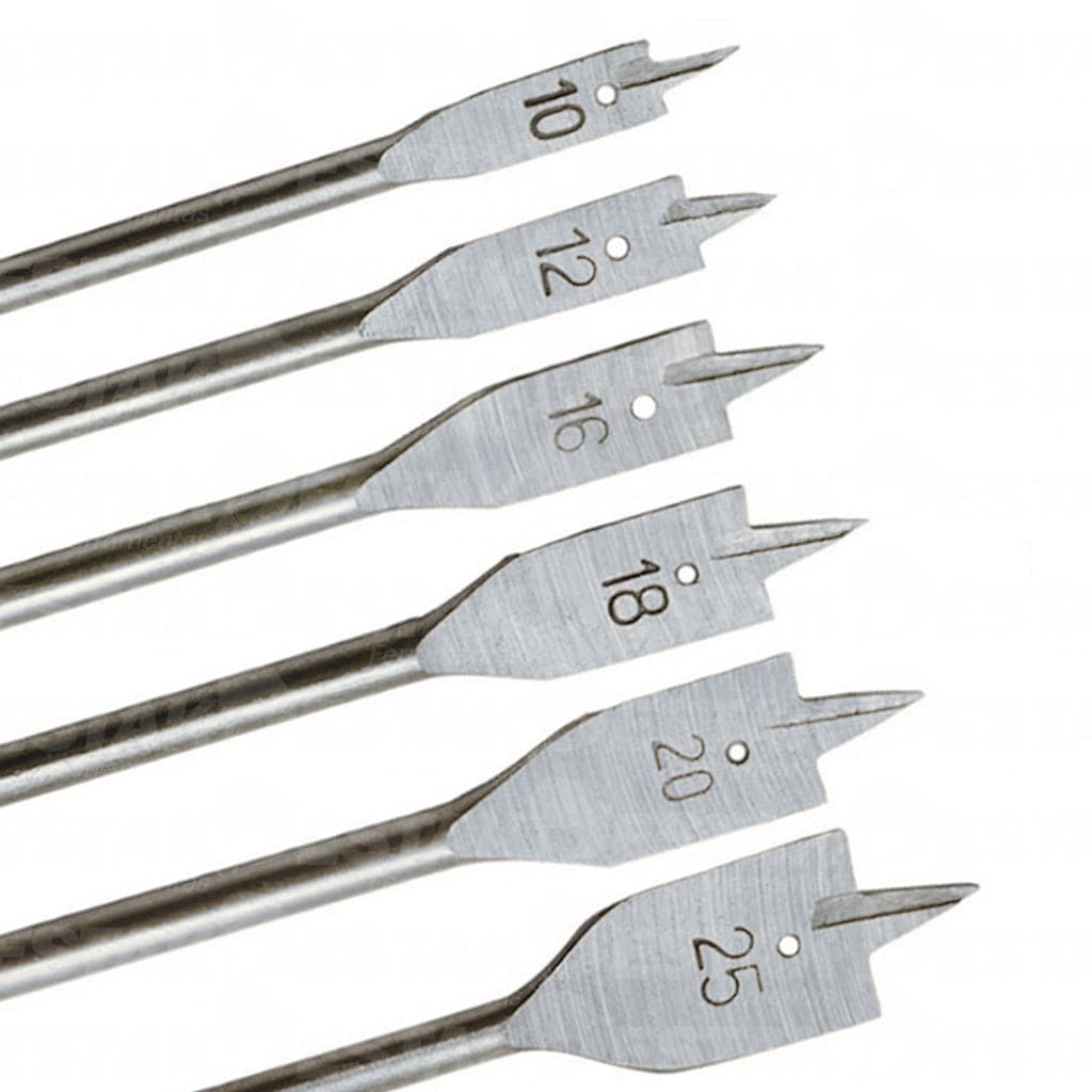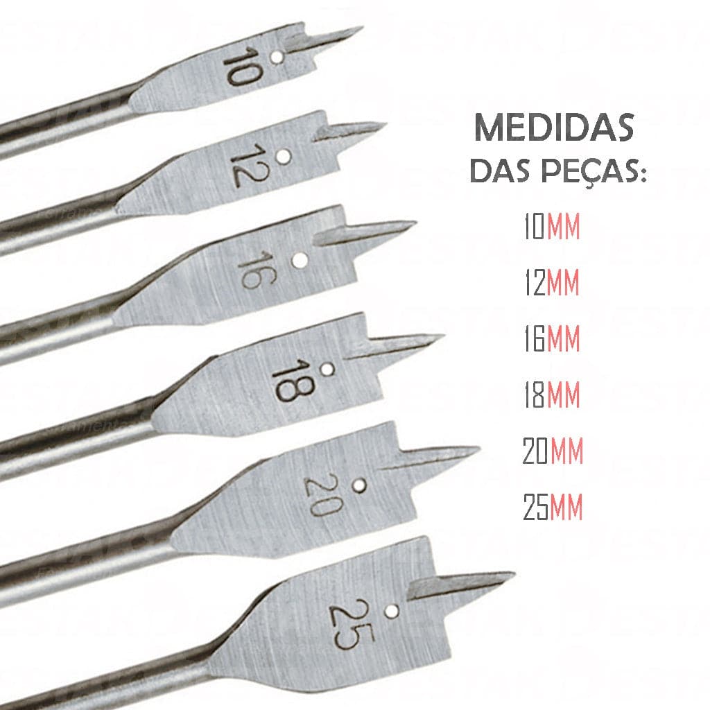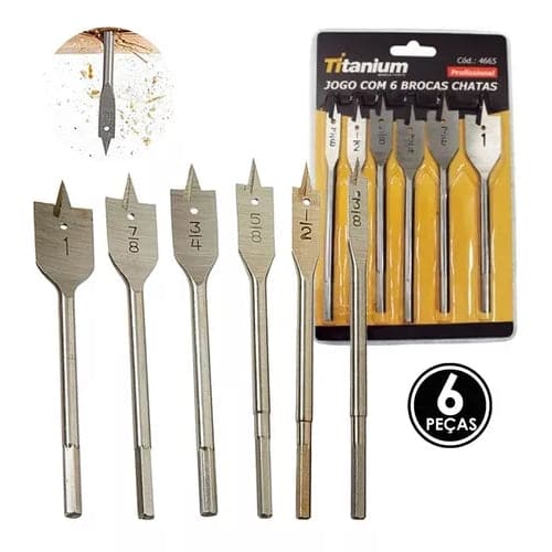 Um "jogo com 6 brocas chatas para madeira" é um conjunto de seis brocas projetadas especificamente para perfurar madeira. Essas brocas chatas têm uma ponta plana e larga, geralmente em forma de espátula, que cria um orifício plano e amplo ao perfurar a madeira.Essas brocas chatas são usadas em uma variedade de aplicações, como instalação de dobradiças, encaixes de parafusos, criação de cavilhas e outros trabalhos de marcenaria que requerem furos limpos e precisos em madeira. Essas brocas chatas para madeira são geralmente utilizadas em furadeiras ou parafusadeiras elétricas e podem ser encontradas em lojas de ferramentas e materiais de construção. Certifique-se de selecionar o tamanho adequado para o seu projeto com base nas suas necessidades específicas.